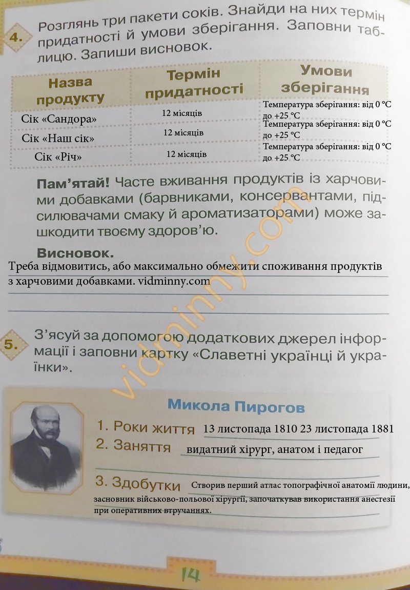4. Розглянь три пакети соків. Знайди на них терміни придатності й умови зберігання. Заповни таблицю. Запиши висновок.