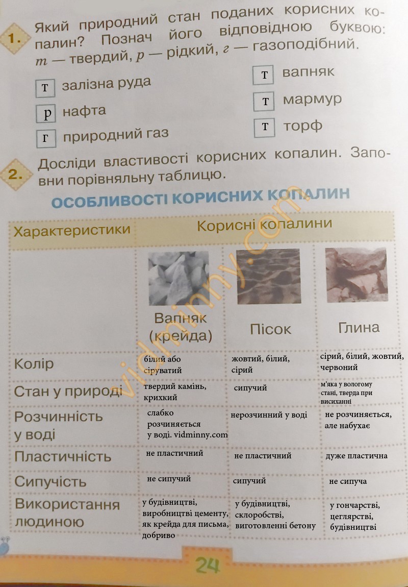 1. Який природний стан поданих корисних копалин? Познач його відповідною буквою т - твердий, р - рідкий, г - газоподібний.