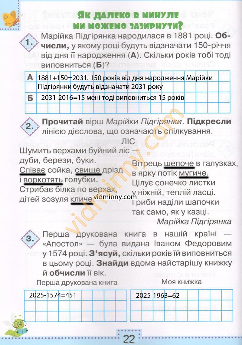 1. Марійка Підгірянка народилася в 1881 році. Обчисли, у якому році будуть відзначати 150-річчя від дня її народження (А). Скільки років тобі тоді виповниться (Б)?