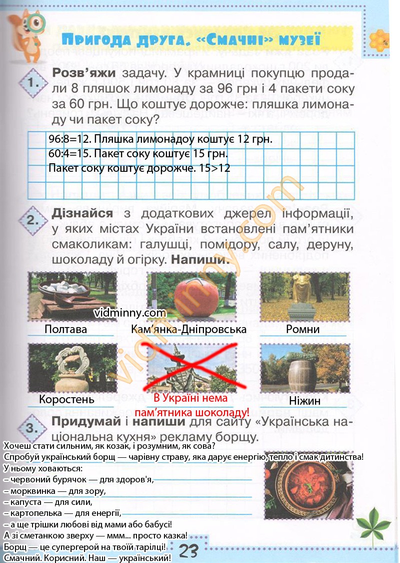 2. Дізнайся з додаткових джерел інформації, у яких містах України встановлені пам'ятники смаколикам: галушці, помідору, салу, деруну, шоколаду й огірку. Напиши.