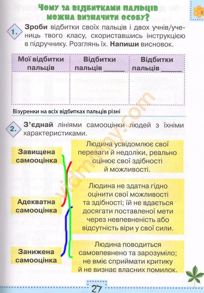 1. Зроби відбитки своїх пальців і двох учнів/учениць твого класу, скориставшись інструкцією в підручнику. Розглянь їх. Напиши висновок.