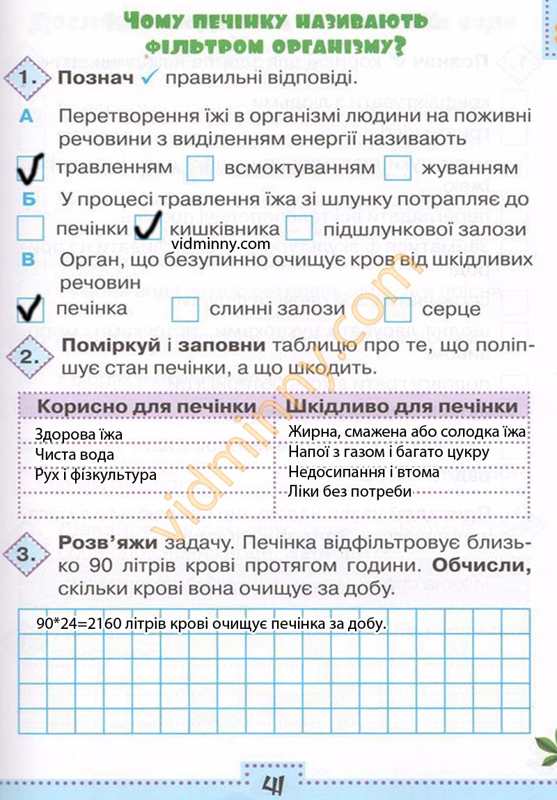 3. Розв'яжи задачу. Печінка відфільтровує близько 90 літрів крові протягом години. Обчисли, скільки крові вона очищує за добу.