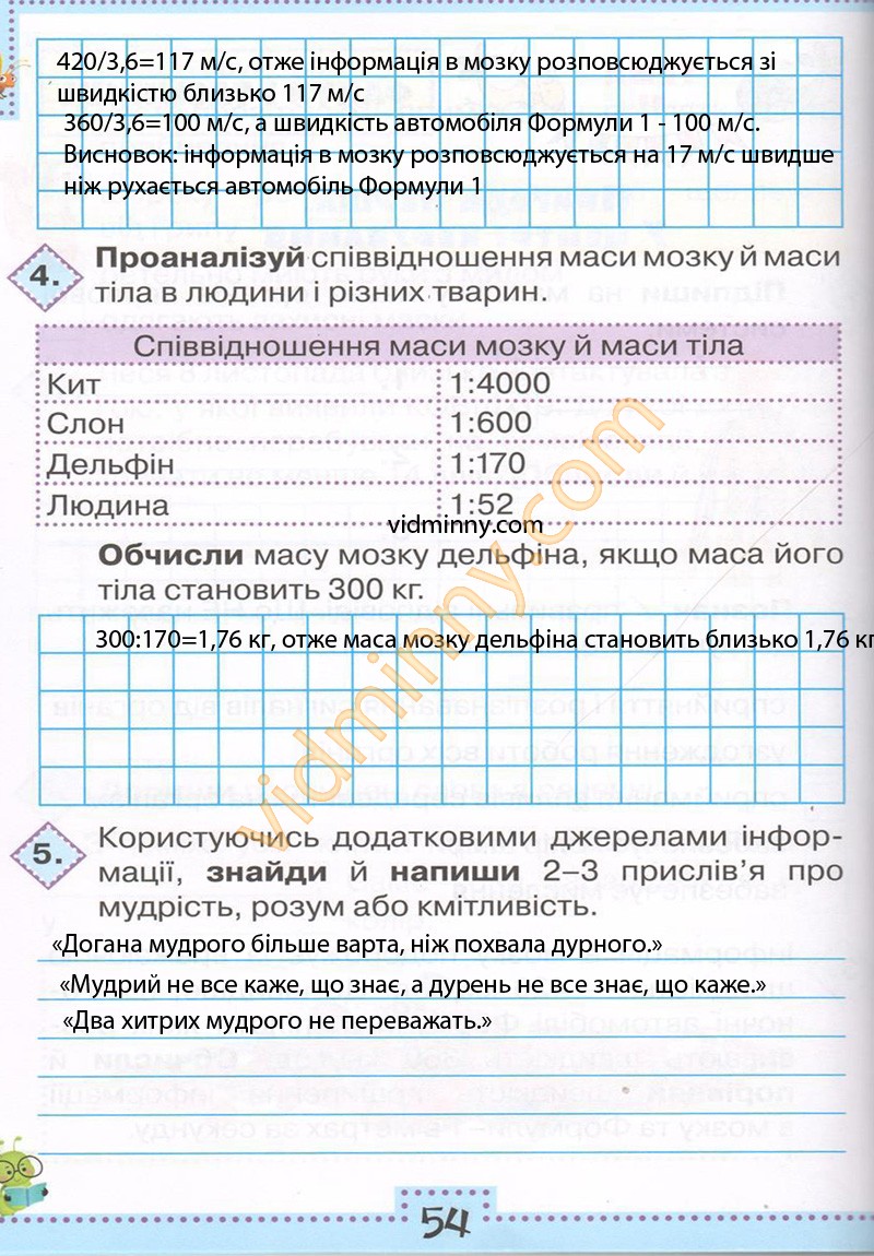 4. Проаналізуй співвідношення маси мозку й маси тіла в людини і різних тварин.