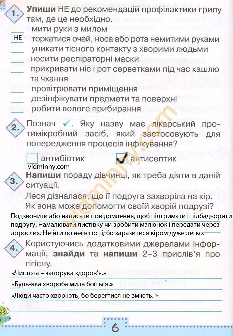 4. Користуючись додатковими джерелами інформації, знайди та напиши 2-3 прислів'я про гігієну.