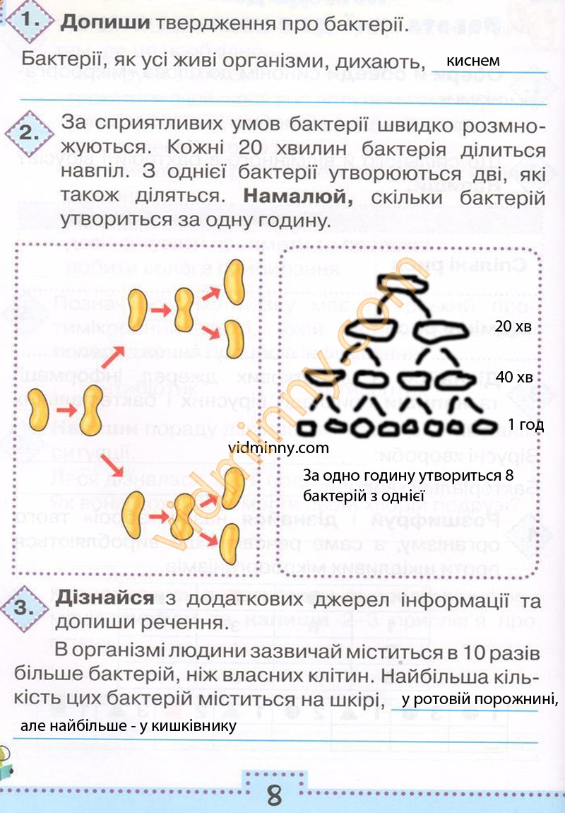 2. За сприятливих умов бактерії швидко розмножуються. Кожні 20 хвилин бактерія ділиться навпіл. З однієї бактерії утворюються дві, які також діляться. Намалюй, скільки бактерій утвориться за одну годину.