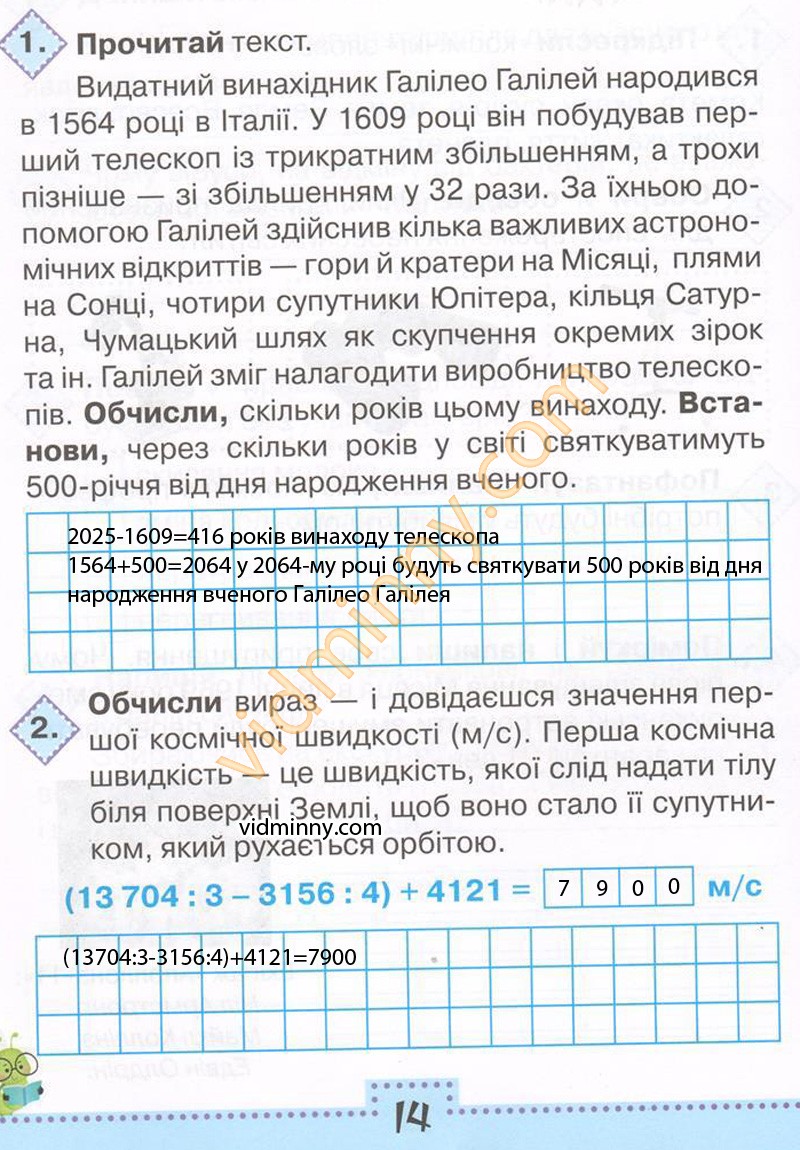 Видатний винахідник Галілео Галілей народився в 1564 році в Італії. У 1906 році він побудував перший телескоп із трикратним збільшенням, а трохи пізніше - зі збільшенням у 32 рази. За їхньою допомогою Галілей здійснив кілька важливих астрономічних відкриттів - гори й кратери на Місяці, плями на Сонці, чотири супутники Юпітера, кільця Сатурна, Чумацький шлях, як скупчення окремих зірок та ін. Обчисли, скільки років цьому винаходу. Встанови, через скільки років у світі святкуватимуть 500-річчя від дня народження вченого.