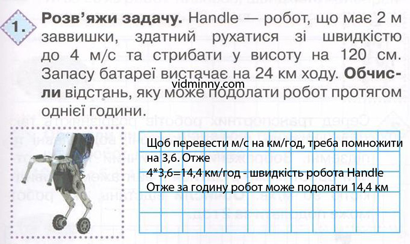 1. Розв'яжи задачу. Handle - робот, що має 2 м заввишки, здатний рухатися зі швидкістю до 4 м/с та стрибати у висоту на 120 см. Запасу батареї вистачає на 24 км ходу. Обчисли відстань, яку може подолати робот протягом однієї години.