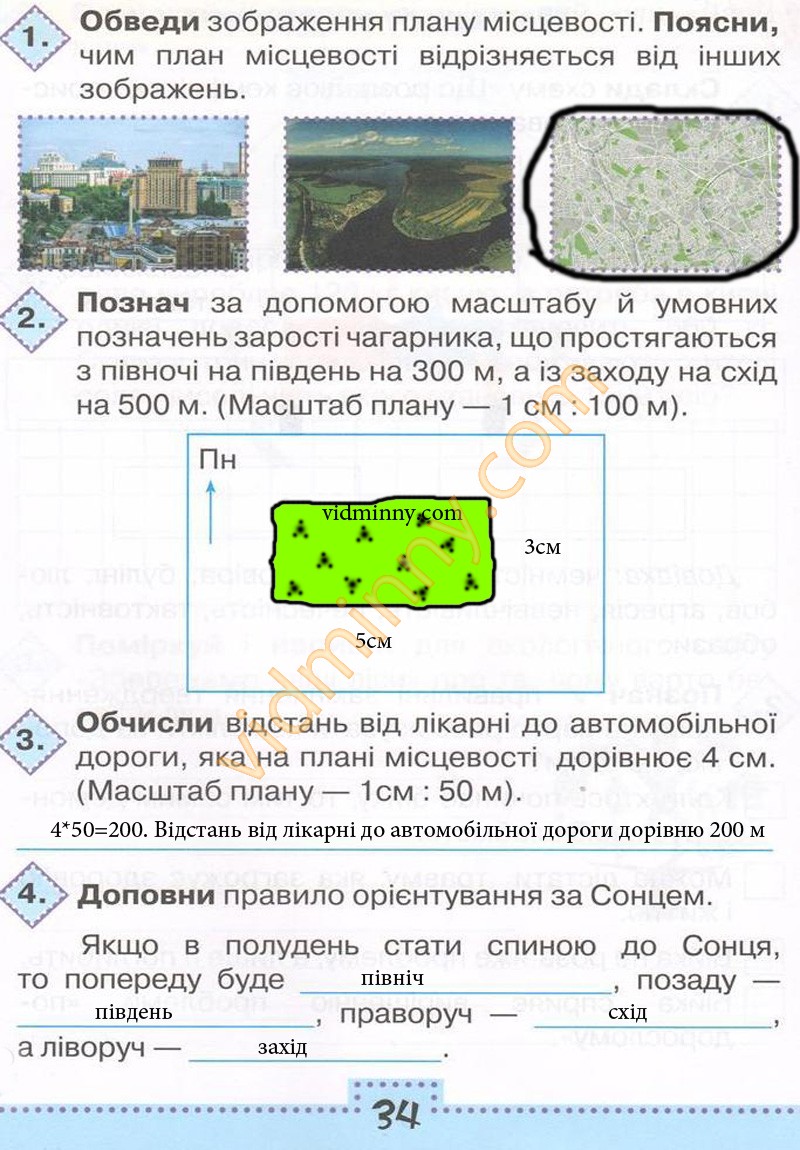 3. Обчисли відстань від лікарні до автомобільної дороги, яка на плані місцевості дорівнює 4 см. (Масштаб плану - 1 см : 50 м).