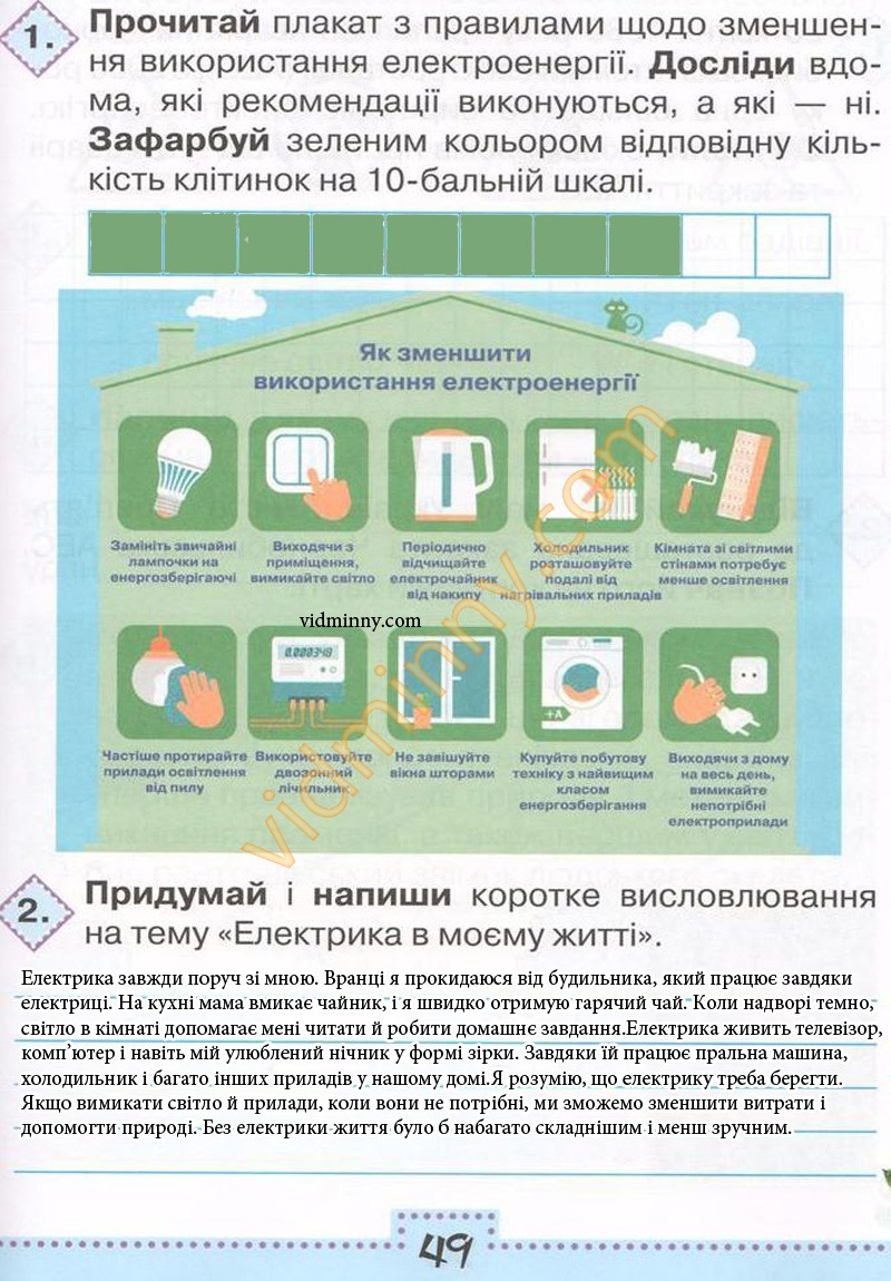 1. Прочитай плакат з правилами щодо зменшення використання електроенергії. Досліди вдома, які рекомендації виконуються, а які - ні.
