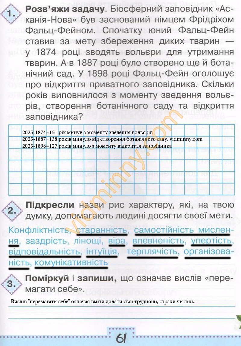 1. Розв'яжи задачу. Біосферний заповідник "Асканія-Нова" був заснований німцем Фрідріхом Фальц-Фейном. Спочатку юний Фальц-Фейн ставив за мету збереження диких тварин - у 1874 році зводять вольєри для утримання тварин. А в 1887 році було створено ще й ботанічний сад. У 1898 році Фальц-Фейн оголошує про відкриття приватного заповідника. Скільки років виповнилося з моменту зведення вольєрів, створення ботанічного саду та відкриття заповідника?